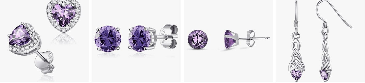 - Made with Trust. February (Amethyst) Birthstone Earrings Created with Zircondia Crystals by Philip Jones. Buy with confidence with our 12-month manufacturer warranty with your Earrings set with premium Cubic Zirconia crystals.