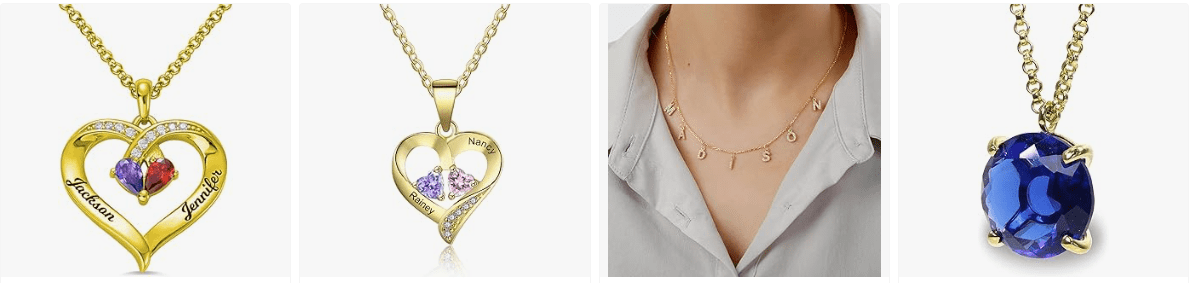 - Customisable fonts, chain lengths, and gemstone styles