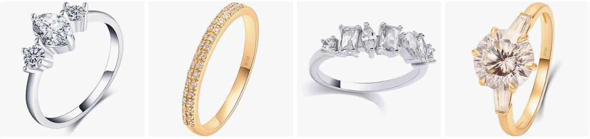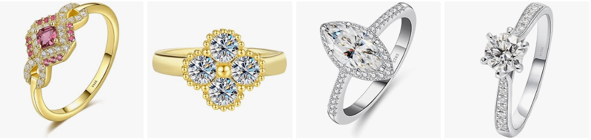 - Large style selection: Find different cluster shapes, band colours, and stone arrangements easily.