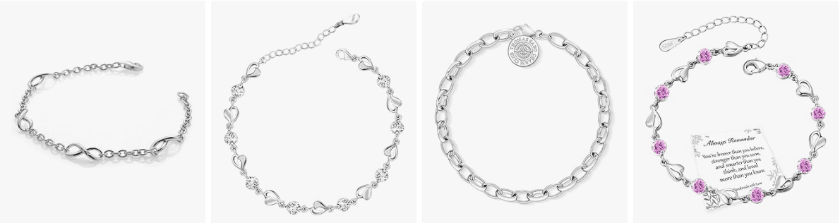 - Silver, gold and rose-gold bracelets offer numerous combinations including bangles, bracelets, charm bracelets, friendship and pearl bracelets