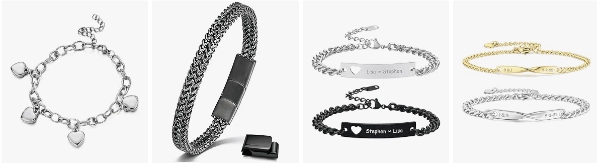 Shoppers can compare styles, materials and engraving options quickly, helping them choose the perfect bracelet for their proposal moment. Many collections include minimalist bands, bold chain bracelets, personalised cuffs and elegant link designs.