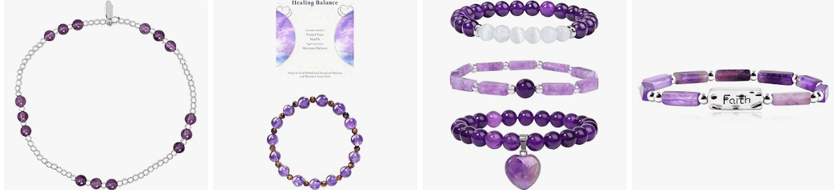 - Multi-Layer Bead Bracelets: This amethyst bracelet set features multi-layer designs with varying bead sizes and purple tones, exuding lovely shine and texture. The faceted purple beads boost luster, while beads add a glittering effect