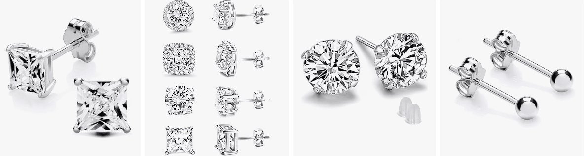 - Material of Sterling Silver Stud Earrings: Sterling silver stud earrings by 925 Sterling Silver Post and AAAAA+ Cubic Zirconia. Hypoallergenic, rust-proof, non-fading. And would not irritate your ears and they are the best choice for sensitive ears. These silver studs are the classic and so elegant that women of all ages can enjoy them all day.